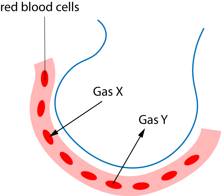 9. There is a high concentration of gas X in the air, and a low concentration in the blood shown in the diagram above. This means gas X pass into the blood in a process called..
