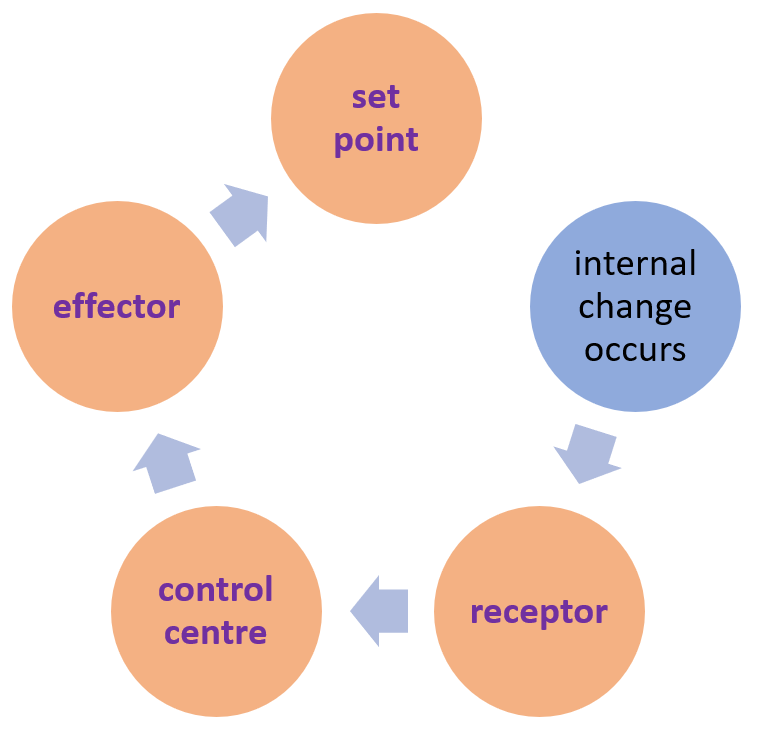 1-5: This diagram models a homeostatic mechanism. e.g. Body temperature has a set point of around 37oC. When the body temperature rises temperature receptors in the skin are stimulated and send impulses to the control centre in the hypothalamus. Nervous impulses are sent to the skin to stimulate effectors to bring down the body temperature to the set point.