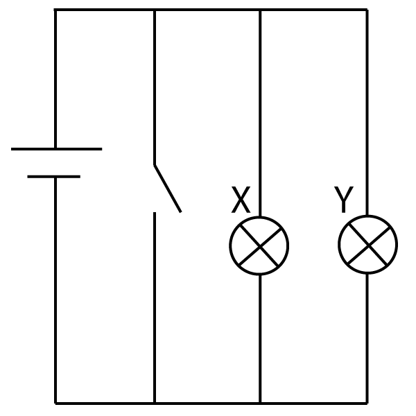 7. A student wants to add a switch to the circuit below to turn bulb X on/off but leave light bulb Y on. Where should it go?