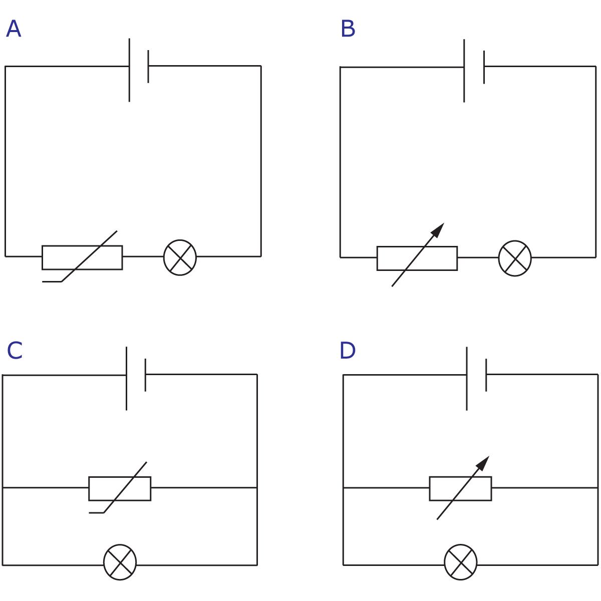8. A variable resistor is used to vary the brightness of a bulb. Which circuit correctly shows the right components and the right circuit layout?