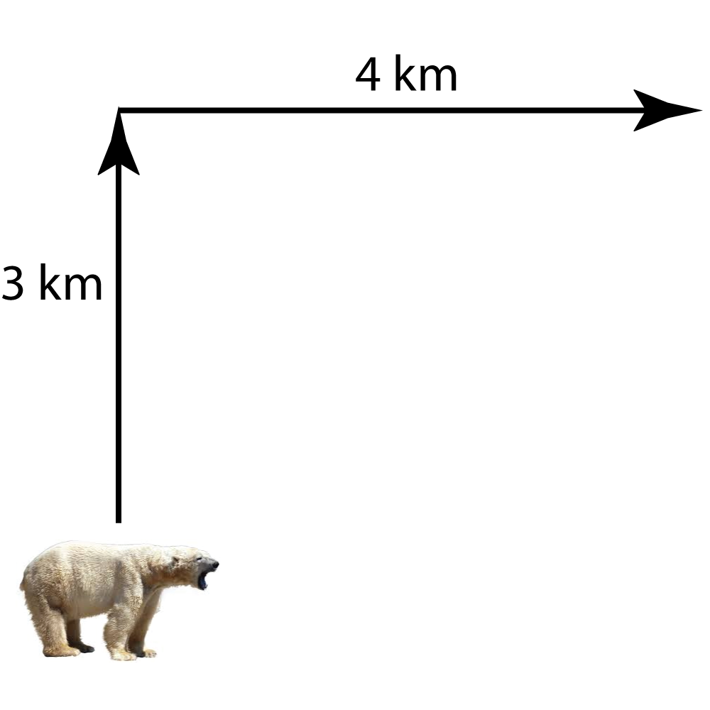 4. A polar bear walks 8 km north searching for food, and then 5 kilometers south again. Which of these gives the total distance travelled and displacement of the bear at the end of the journey?